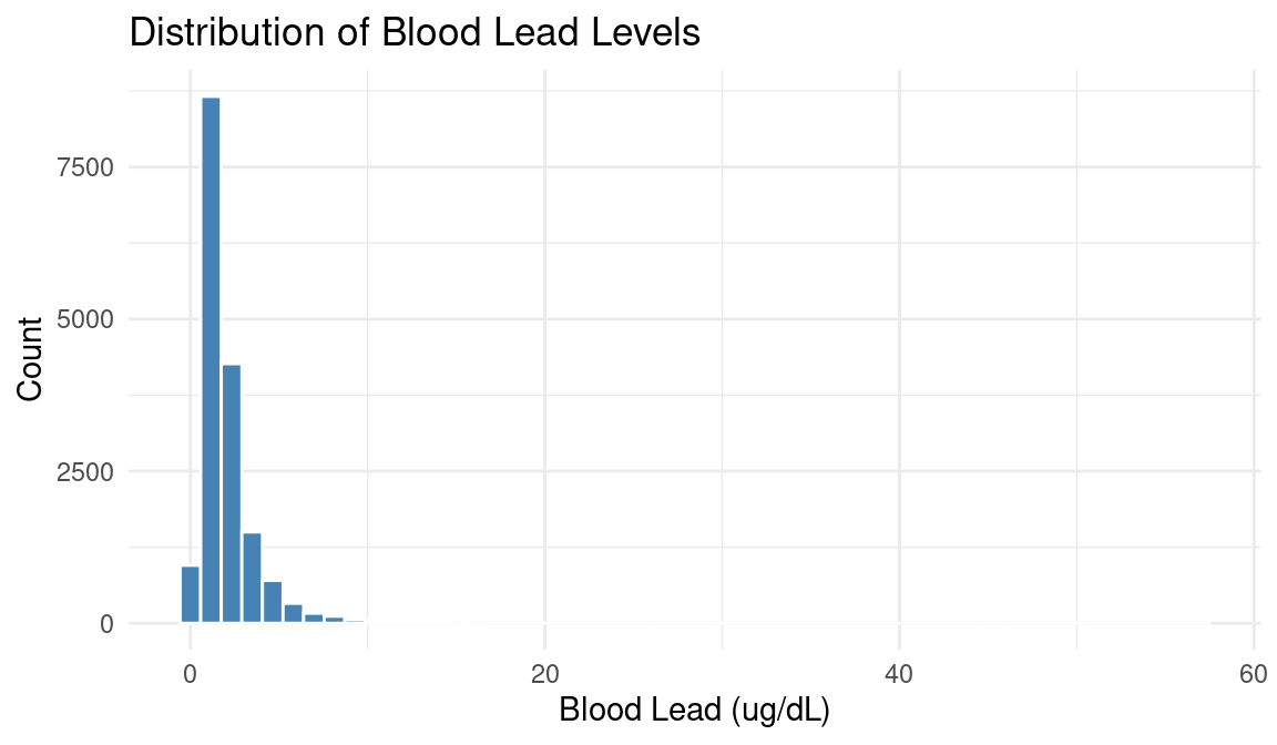labs (x = "Blood Lead (ug/dL)" , y = "Count" ,
