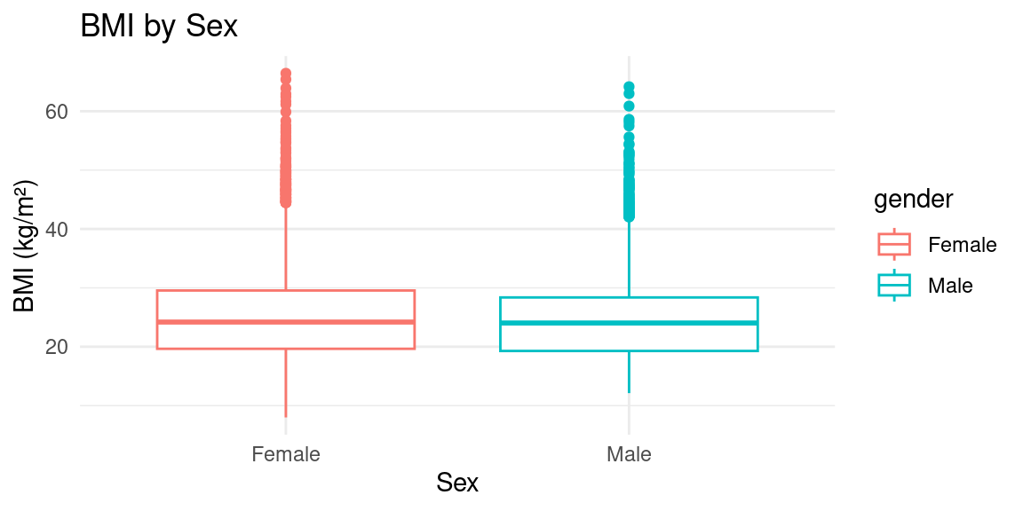 ggplot(nhData, aes(x = gender, y = BMXBMI, color = gender)) +geom_boxplot() +labs(x ="Sex", y ="BMI (kg/m²)", title ="BMI by Sex") +theme_minimal()