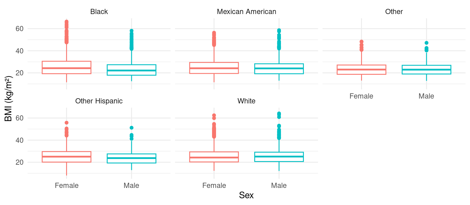 ggplot(nhData, aes(x = gender, y = BMXBMI, color = gender)) +geom_boxplot() +facet_wrap(~ethnicity) +labs(x ="Sex", y ="BMI (kg/m²)") +theme_minimal() +theme(legend.position ="none")