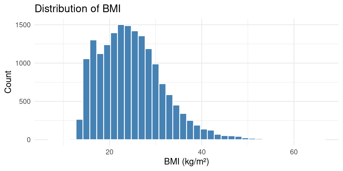 ggplot(nhData, aes(x = BMXBMI)) +geom_histogram(bins =40, fill ="steelblue", color ="white") +labs(x ="BMI (kg/m²)", y ="Count", title ="Distribution of BMI") +theme_minimal()