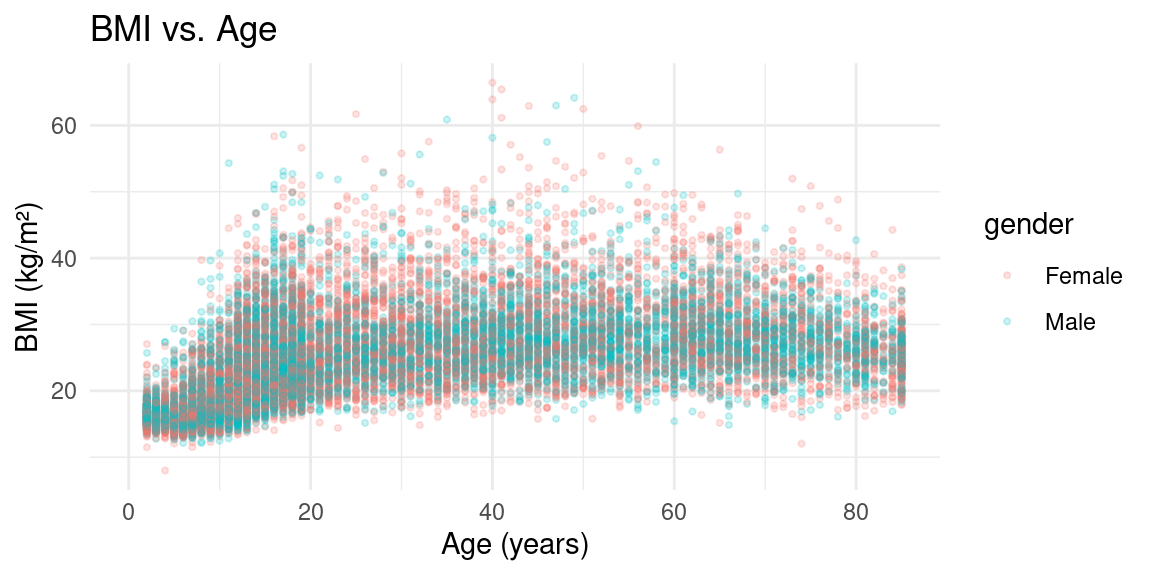 ggplot(nhData, aes(x = RIDAGEYR, y = BMXBMI, color = gender)) +geom_point(alpha =0.2, size =0.8) +labs(x ="Age (years)", y ="BMI (kg/m²)", title ="BMI vs. Age") +theme_minimal()