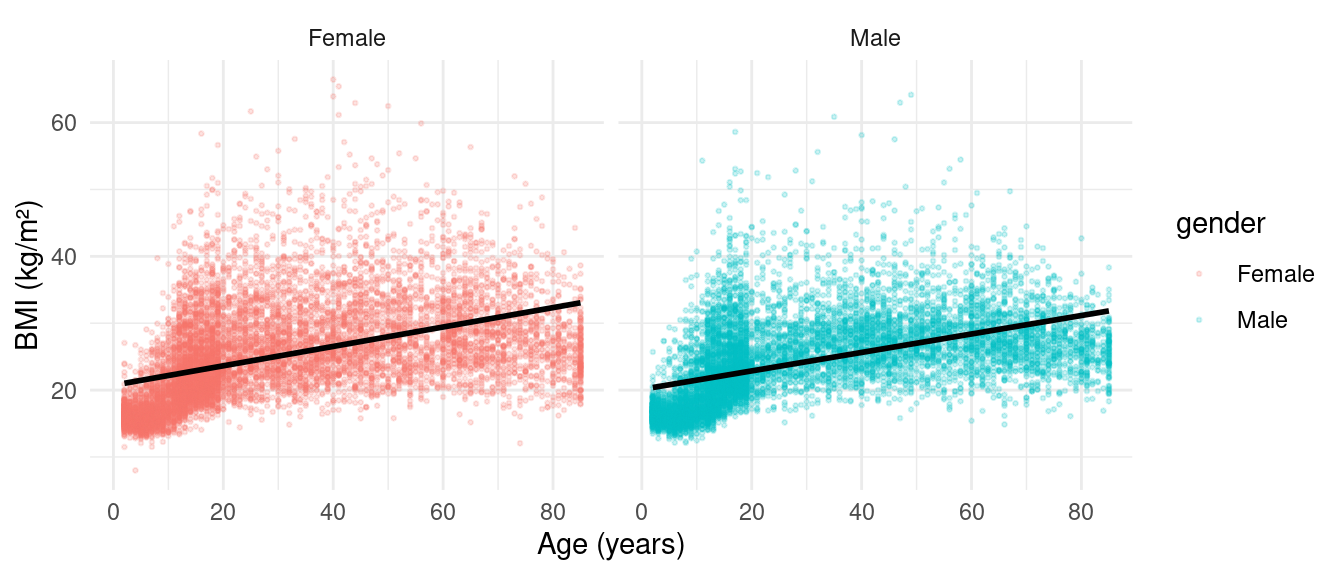 ggplot(nhData, aes(x = RIDAGEYR, y = BMXBMI, color = gender)) +geom_point(alpha =0.2, size =0.5) +facet_wrap(~gender) +geom_smooth(method ="lm", se =FALSE, color ="black") +labs(x ="Age (years)", y ="BMI (kg/m²)") +theme_minimal()