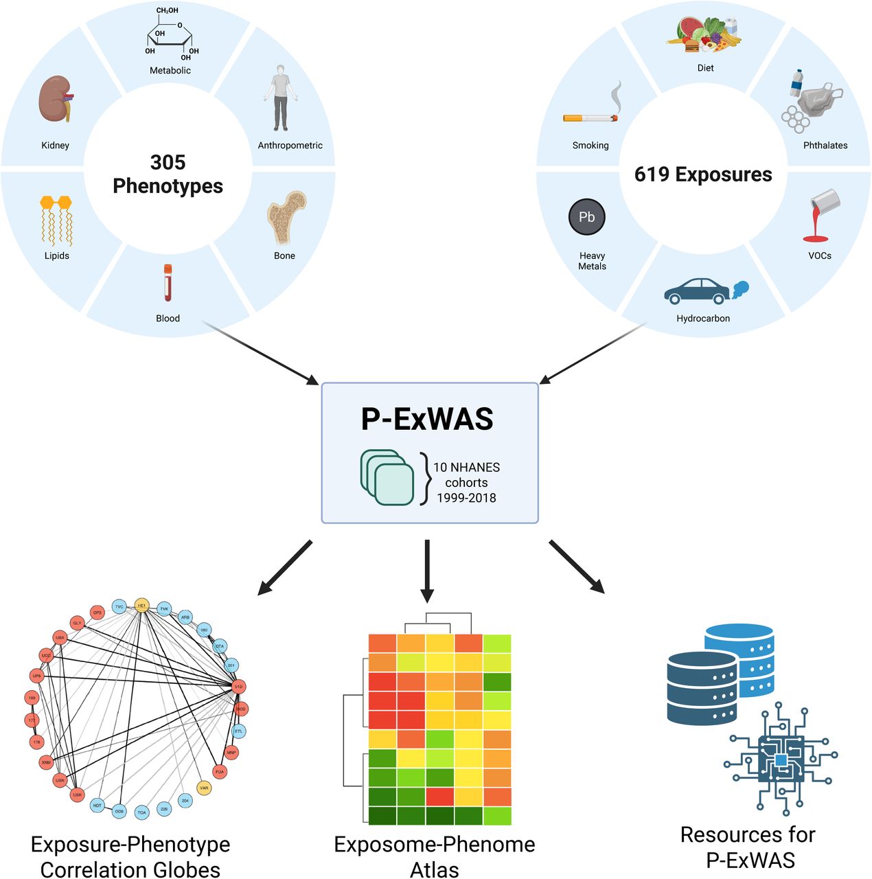 Figure 1: The P-ExWAS study design. 305 phenotypes and 619 exposures across 10 NHANES cohorts (1999-2018) are combined into the Exposome-Phenome Atlas, correlation globes, and open-source computational resources.