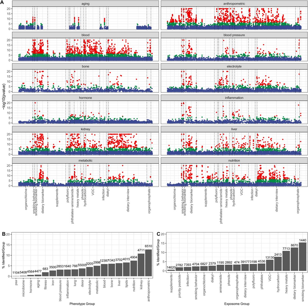 Figure 2: Manhattan-style plots of -log10(p-value) by phenotype category (red = Bonferroni, green = FDR, blue = NS). Right panels show % significant associations by phenotype and exposure group.