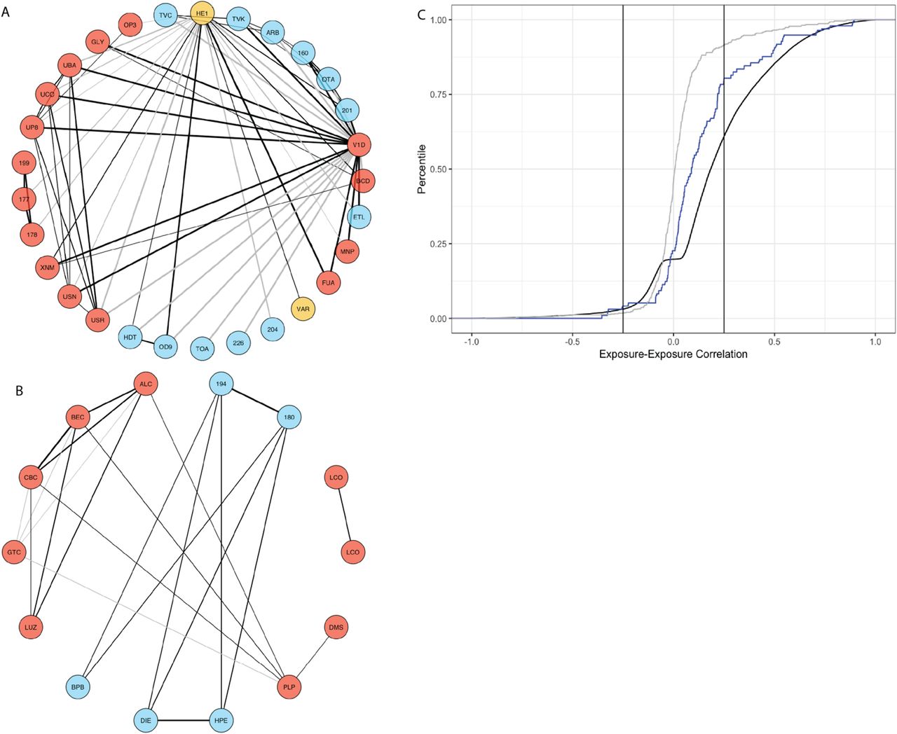 Some exposure pairs associate with phenotypes in strikingly similar ways: