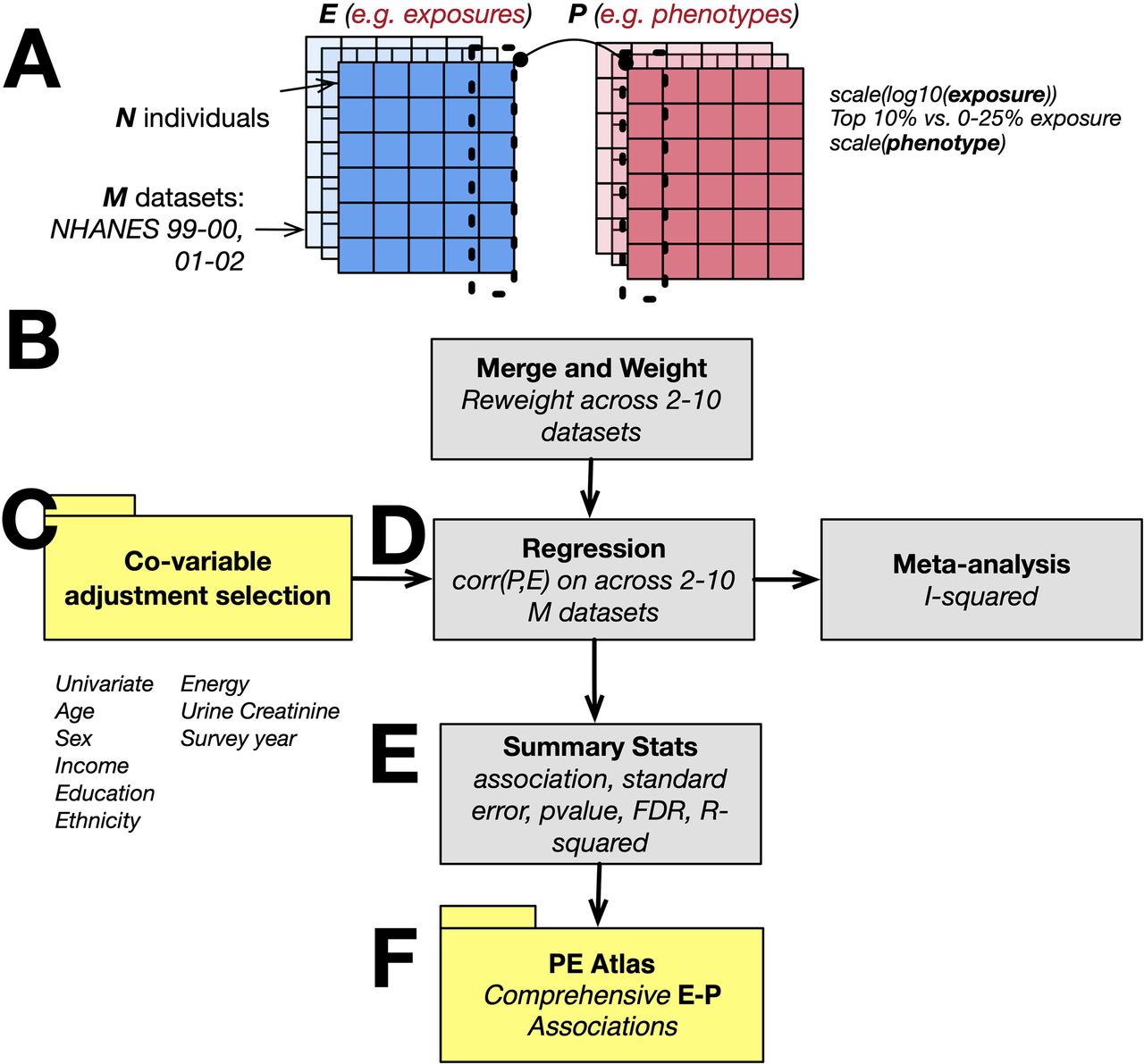 Figure 6: The P-ExWAS pipeline. (A) Exposure and phenotype matrices across M NHANES datasets. (B) Merge and reweight across 2-10 datasets. (C) Nine covariate adjustment models. (D) Survey-weighted regression and meta-analysis. (E) Summary statistics. (F) The PE Atlas.