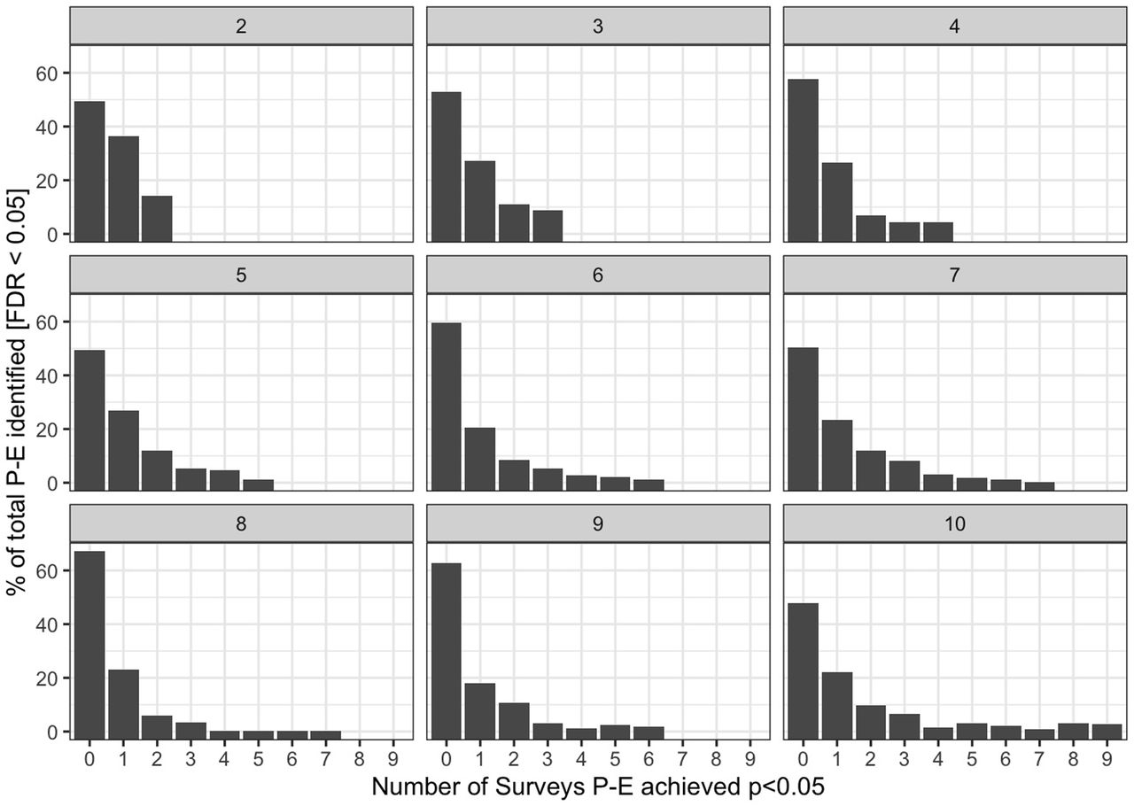 Figure 7: Replication rates across NHANES waves. Each facet shows associations available in K waves (2-10). X-axis: number of waves achieving p < 0.05. Y-axis: % of FDR-significant associations.